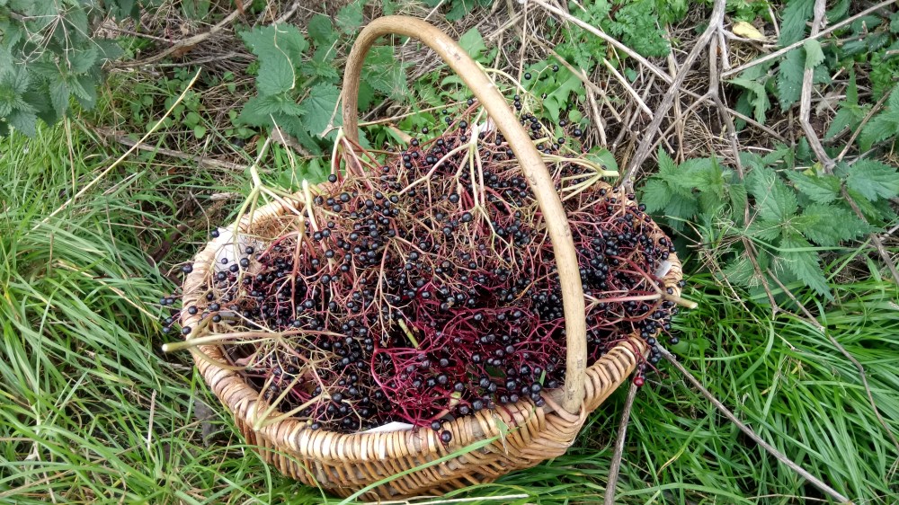 By the way, I sincerely recommend you buy a basket. Nothing else quite does the same job. Certainly not plastic bags, which will make your fruit/herbs/mushrooms sweat and prematurely rot. A wicker basket lets the air in, and is a nice natural material. Oh, and delicious an all as they look, please do not be tempted to eat raw elderberries from the tree – they are mildly posionous! But we’ll come to that…