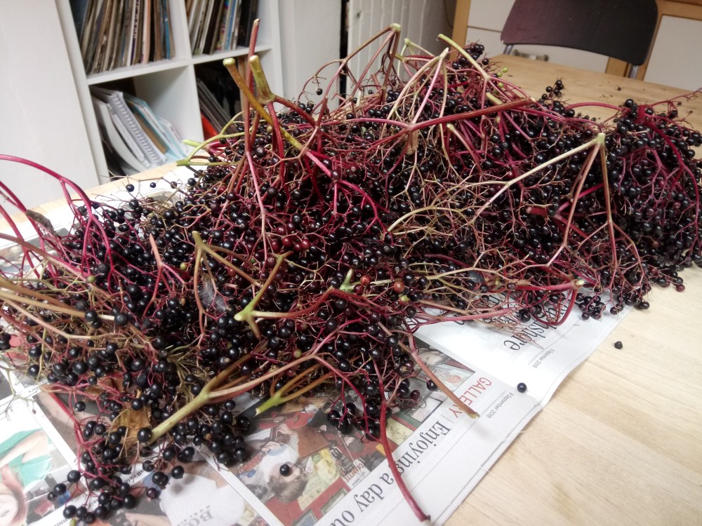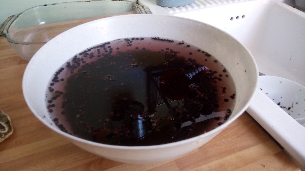 Once you have your berries, you need to pick them off the stems; and you do need to be conscientious about this, because the stems are bitter and will make you sick. Many folk employ the fork method for this; that is to say, they gently drag the prongs of the fork down the stem, liberating the berries as they go. I’ve developed my own technique of very lightly rubbing the berries off betwixt finger and thumb. Whatever way you do this, be warned that it is pretty time-consuming. Many people consider it to be a frightful pain in the hole, but I recommend that you get zen about it – put on some music, or maybe a podcast, and try not to resist the process. Just let the mind wander…